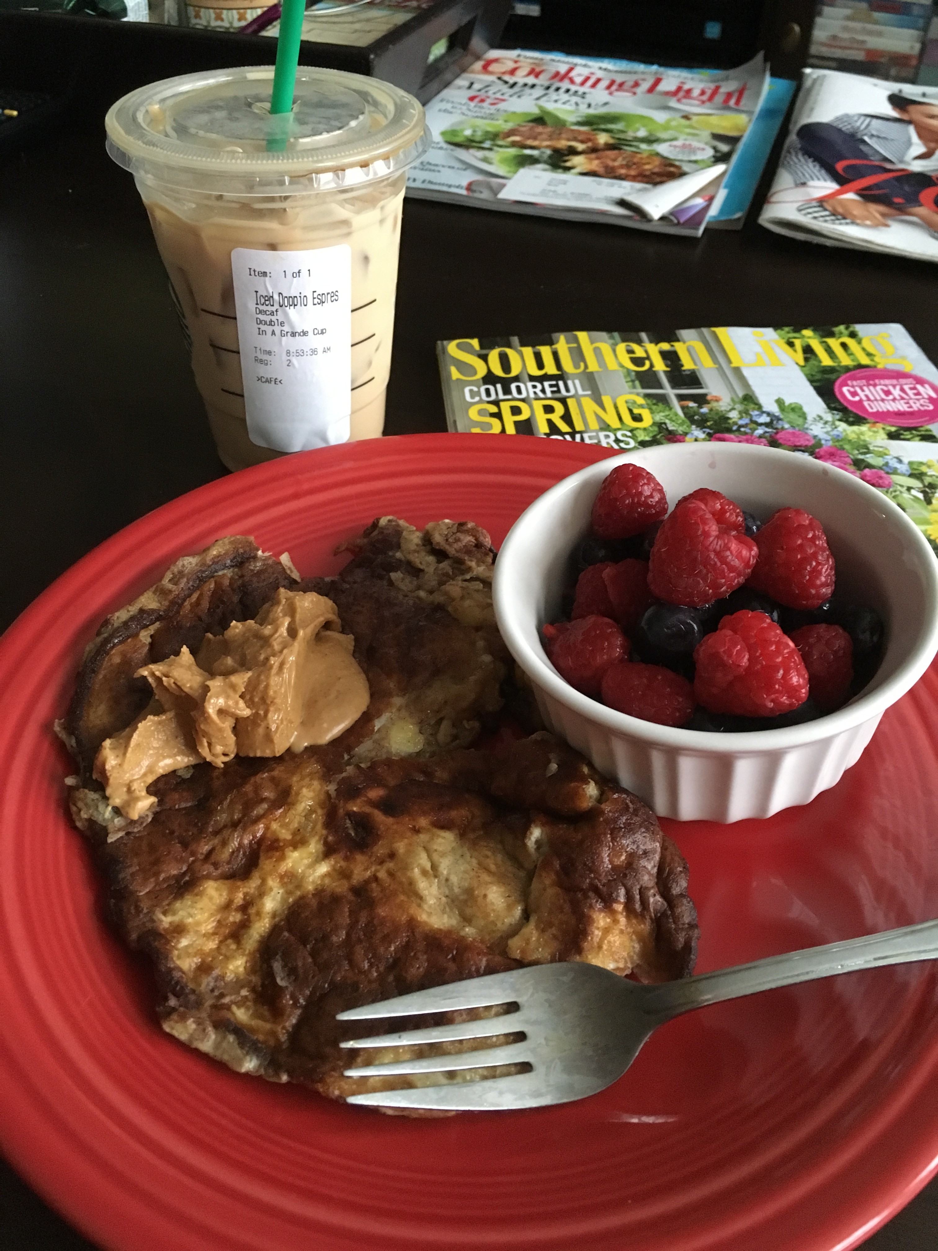 I picked up coffee for us at Starbucks and made a Paleo pancake out of a banana and egg topped with peanut butter for breakfast. It doesn’t look very appealing, but it tasted delicious!